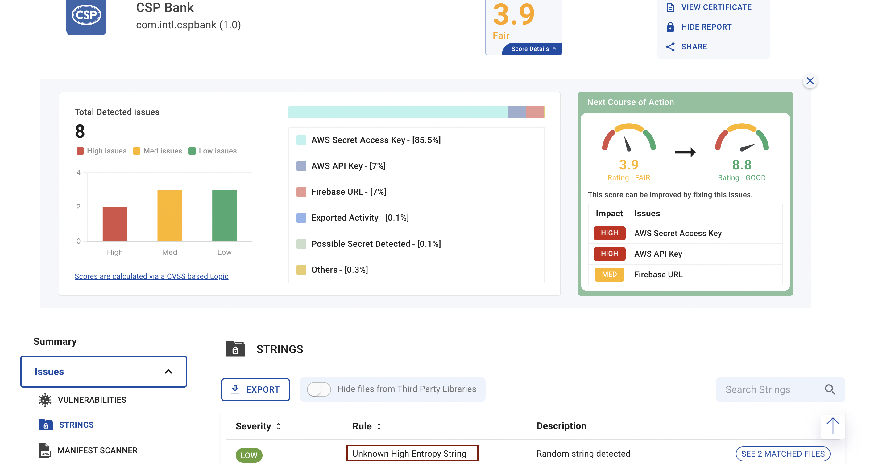 The challenge contains potential clues, one of them is the "Unknown High Entropy String". Upon checking the report of CSP Bank from BeVigil, I found the Unknown High Entropy String under the list of Issues -> Strings.&#x20;