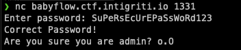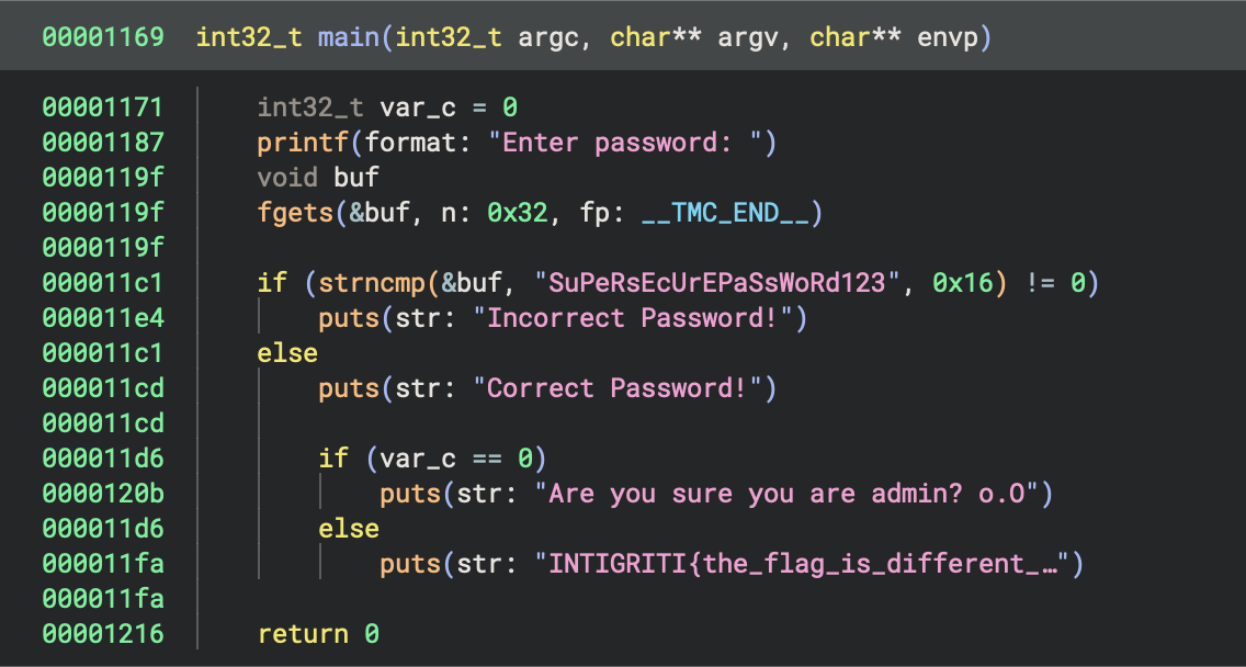 * The program asks for a password input and checks it using `strncmp` against the hardcoded string `"SuPeRsEcUrEPaSsWoRd123"`.